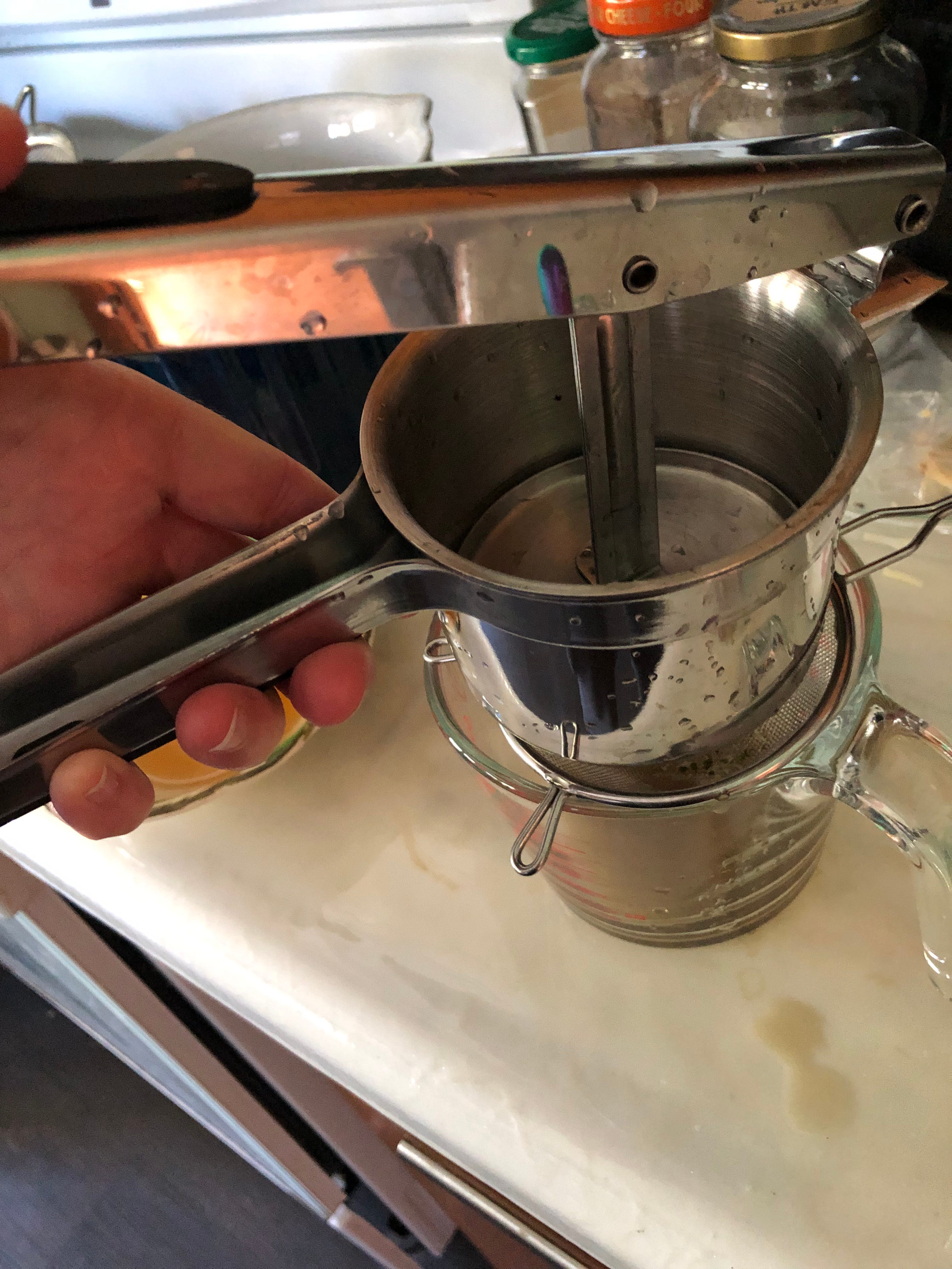 Strain the liquid into a small bowl. I use a potato ricer for this, to squeeze everything out thourougly! I put a fine mesh strainer below the ricer to catch any small pieces that slip through the holes.