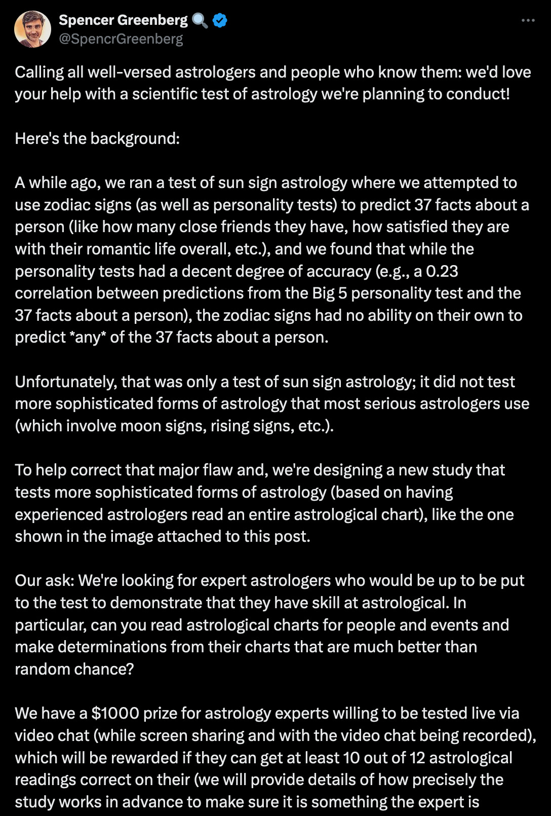 A post by someone named Spencer Greenberg has been going around on Twitter, claiming to want to start a scientific study into astrology. It claims it will be fair, reasonable, and so on.