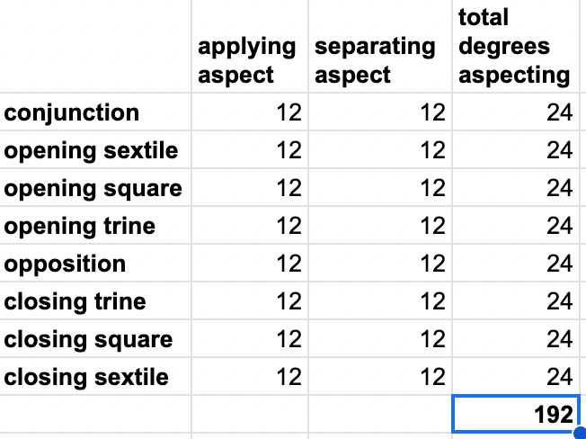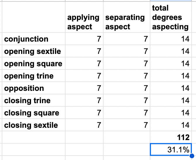 The Moon aspects Mercury (in “major” aspects) for roughly 1/2 the time out of every synodic cycle, if we use a 12º orb for the Moon and only major aspects. How do I figure? Here’s the breakdown of the Moon going around a 360º circle, and how many degrees of that circle it is in orb of aspecting Mercury: