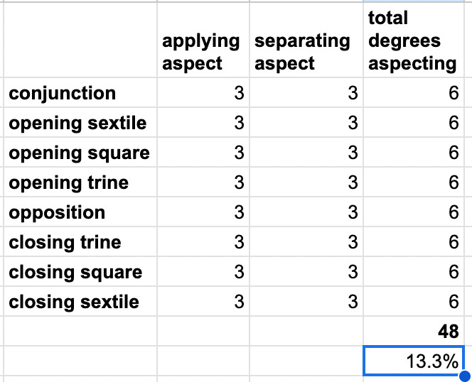 The Moon aspects Mercury (in “major” aspects) for roughly 1/2 the time out of every synodic cycle, if we use a 12º orb for the Moon and only major aspects. How do I figure? Here’s the breakdown of the Moon going around a 360º circle, and how many degrees of that circle it is in orb of aspecting Mercury: