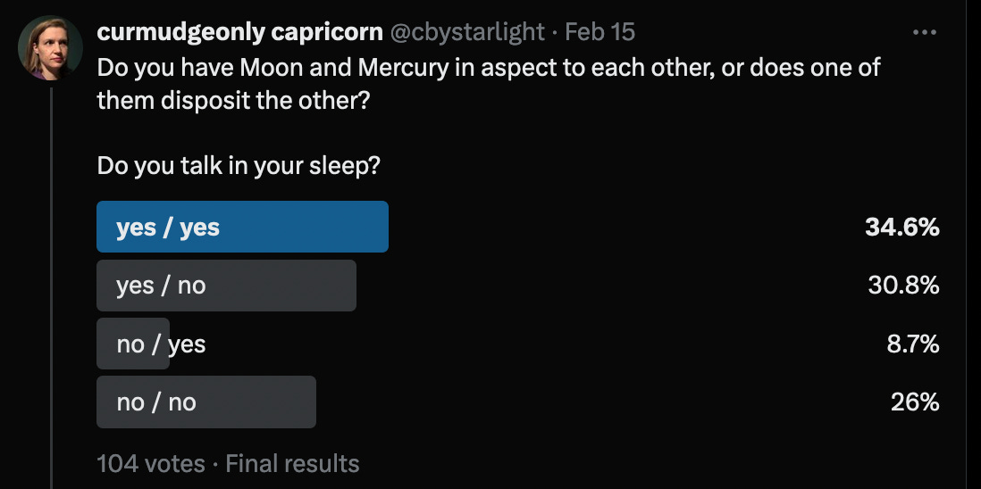 Over half of the people with Moon-Mercury connections talk in their sleep. Whereas only roughly 1/3 of people with no Moon-Mercury connections talk in their sleep. I know it’s just a Twitter poll, so we need large grains of salt here, but it seems like there could be some kind of significant correlation waiting to be discovered.