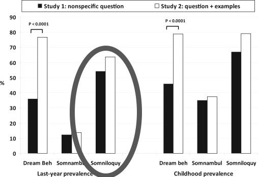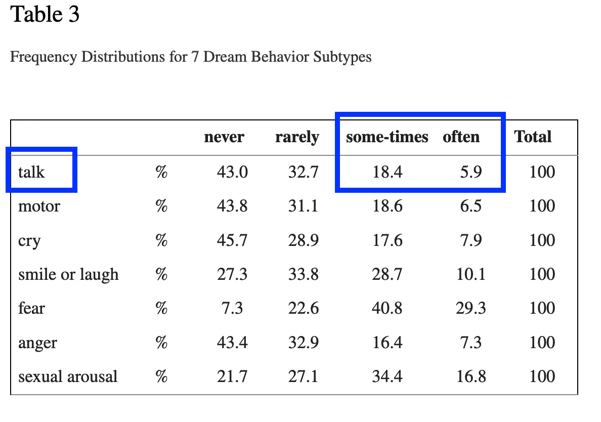 This chart shows how many people have done these behaviors at least once in the past year (left side) and at least once per year during childhood (right side.) The black bars indicate nonspecific questions, such as “how often do you talk in your sleep,” while the white bars indicate more detailed questions, such as “how often have you awakened from a dream about talking to find that you are speaking out loud some of the words in the dream?” I circled the results I’m interested in: prevalence of sleep-talking among adults.