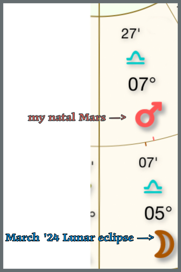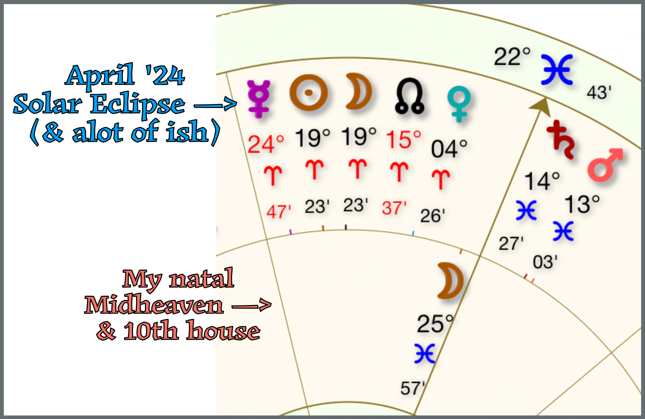 The solar eclipse in two weeks will land in my 10th house. Thankfully, my natal Moon and MC will barely be spared from the orb of the malefic conjunction of Saturn and Mars.